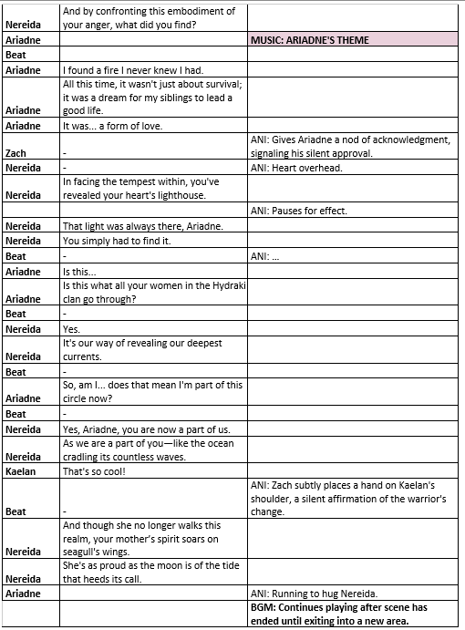 Excerpt from Game Script: AUDRY Come on, Ray. If we can get to one of their helicopters, maybe we can message back to the mainland and... CATHERINE Hold it right there. Audry gasps. We hear slow footsteps approach. CATHERINE (fake niceties, slowly) Audry, isn't it? At last, I finally get to meet one of the school girls who survived that horrendous helicopter crash... Who knew you were a fighter as well! I heard you wanted to speak to me? AUDRY (through grinding teeth) I wanted you to tell me what it was you're doing here because I assumed you might have a decent bone in your body! Instead, you all proved to be monsters! CATHERINE (chuckling) Oh, I wouldn't say that. We're decent human beings, just like you. AUDRY You're nothing like me. CATHERINE And it seems you've taken a liking to these... savages... inhabiting this island. You do know that we came to save you from these creatures, though, don't you? AUDRY (seething) You didn't come to save me. You came to drain this island of its power, so that you can sell it back home! You just want to profit off of something that's not yours! CATHERINE (laughing) You don't know the first thing I want.