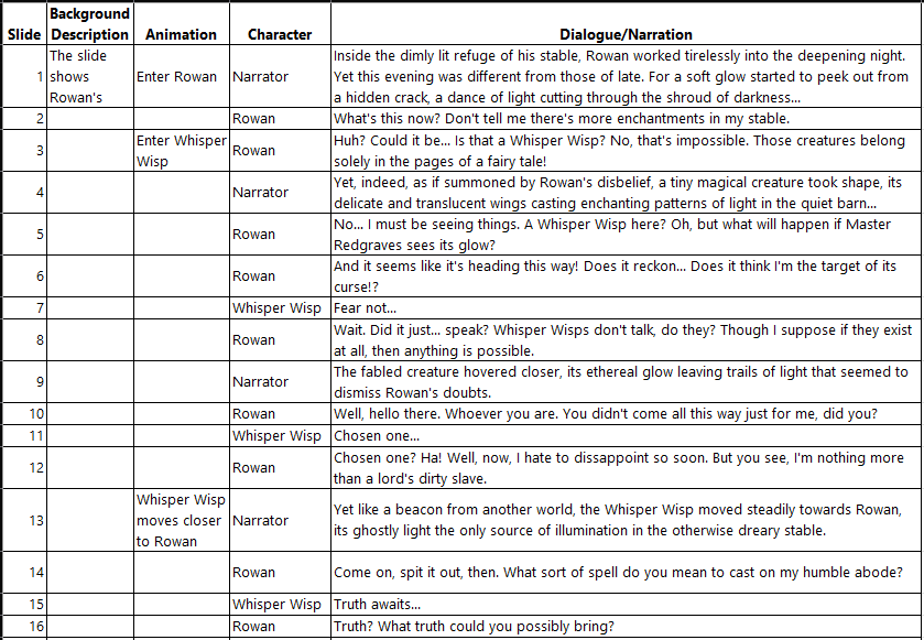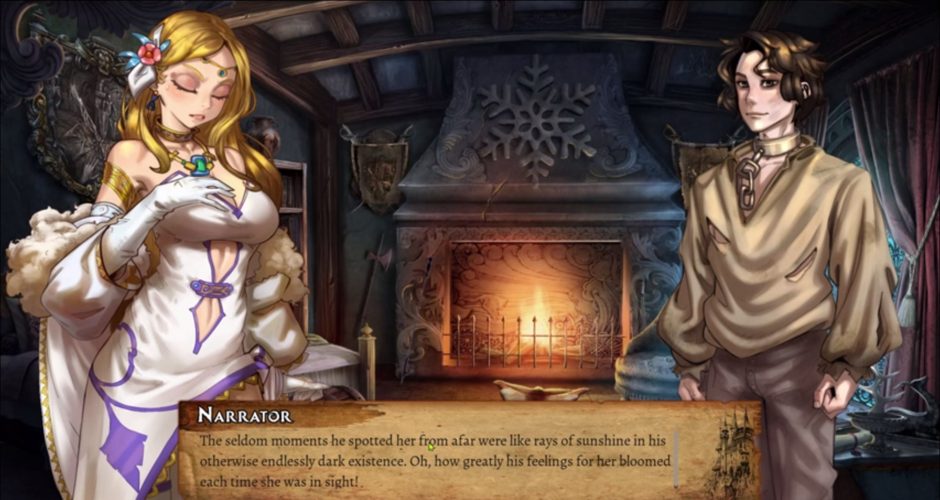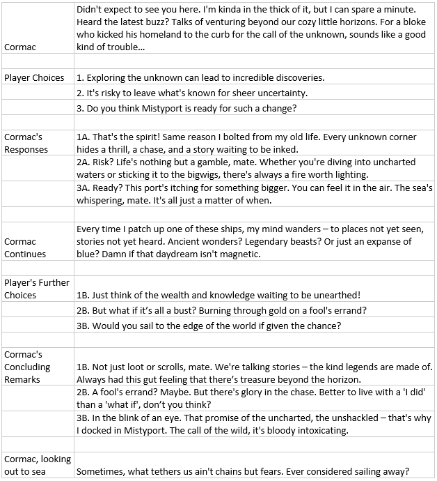 Example of branching narrative in-game: INT. GUILD - NIGHT Masami appears in the middle of the screen. MASAMI (smile) Oh, hello there, handsome. I haven't seen you around here before. PLAYER DIALOG OPTION 1 You must haven't been looking hard enough. PLAYER DIALOG OPTION 2 Yeah, it's actually my first time here. PLAYER DIALOG OPTION 3 Uh... what? A hot girl is actually... t-t-talking to me!? PLAYER DIALOG OPTION 1 You must haven't been looking hard enough. MASAMI (smile) Oh, Ok! A cocky attitude, huh? We'll have to work on that. PLAYER DIALOG OPTION 1.1 You're right, I have a cocky attitude, with the goods to back it up! PLAYER DIALOG OPTION 1.2 What do you mean... "we'll have to work on that"? PLAYER DIALOG OPTION 1.3 Ummm... Do I know you or something? PLAYER DIALOG OPTION 1.1 You're right, I have a cocky attitude, with the goods to back it up! MASAMI (smile) Wow...You've got some bravado, don't you, mister. (smile) But, why are you all alone tonight? (smile) All bark and no bite? PLAYER DIALOG OPTION 1.1.1 I just broke up with my girlfriend, actually. PLAYER DIALOG OPTION 1.1.2 I'm a lone wolf. I don't like getting tied down with one chick. PLAYER DIALOG OPTION 1.1.3 Fine. You got me. I've never been with a girl before. PLAYER DIALOG OPTION 1.1.1 I just broke up with my girlfriend, actually. MASAMI (sad) Oh, I'm sorry to hear that. (smile) On the bright side, that makes you an eligible bachelor. (smile) And I might just be the perfect person you needed to run into.